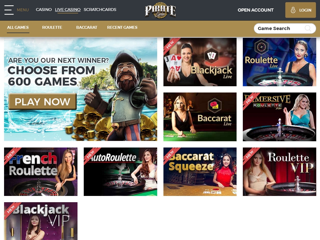 С настоящими крупье можно играть в PirateSpins live casino на рулетке, в блэкджек и баккара, представленных в нескольких разновидностях. Сотрудники говорят на разных языках. Лимиты ставок уточняйте на сайте.