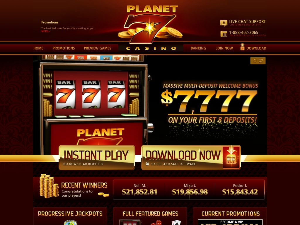 Новые клиенты Planet 7 Casino, которые открывают счета для игры на деньги, получают 100% бонусы на первый восемь депозитов. Стартовый бонус может достигать $777, а остальные семь ограничены $1000 каждый, так что их общая максимальная сумма равна $7777.
