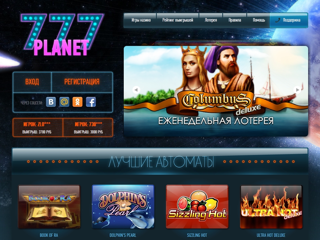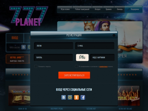 Чтобы зарегистрироваться в казино «Планета 777», нужно придумать имя пользователя и пароль, указать адрес электронной почты и ввести проверочный код. Все, после этого вы можете пополнять счет и приступать к игре. Также можно войти в Planet 777 Casino через аккаунты в социальных сетях.