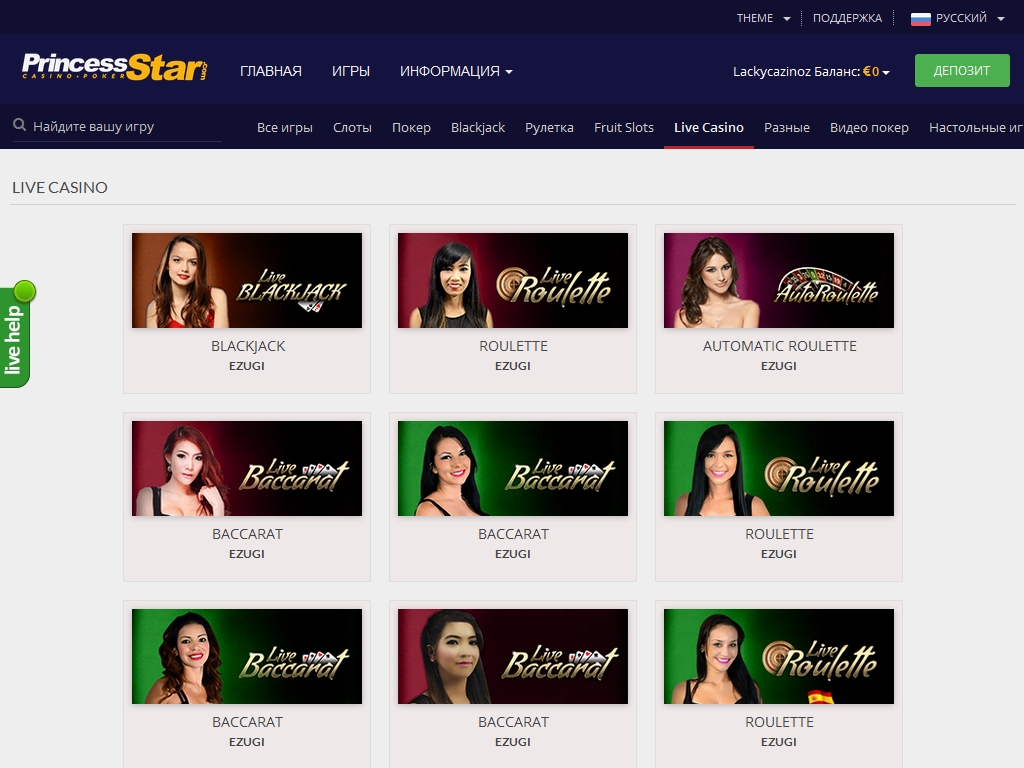 На вкладке Live casino Princess Star представлены игры с настоящими крупье. Они являются сотрудниками компании Ezugi, которая предоставляет услуги в данном формате. Здесь можно играть на рулетке, в блэкджек, покер, баккара. Доступны столы с разными диапазонами ставок.