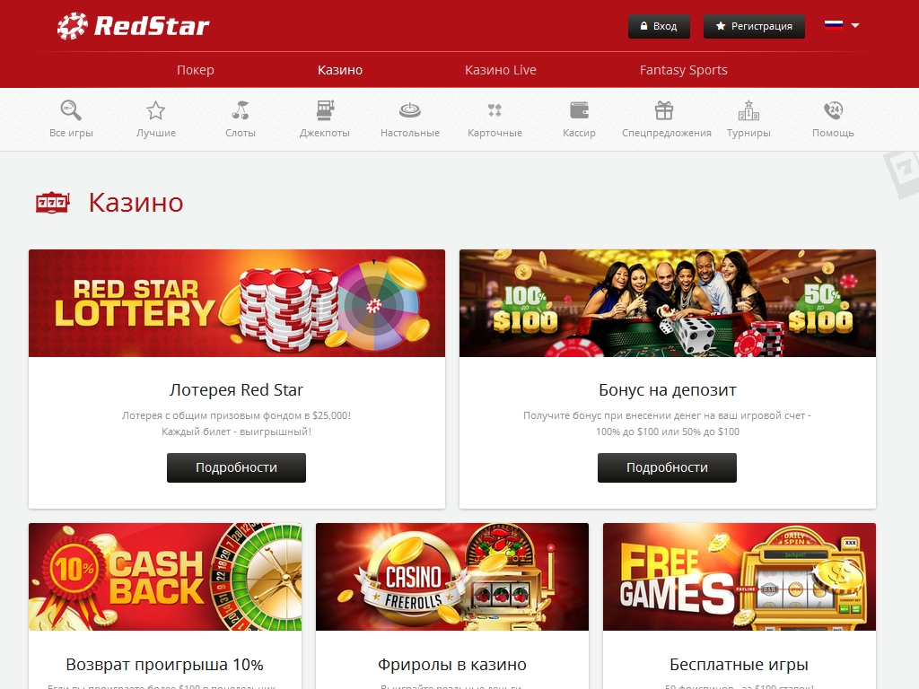 Среди представленного игрового разнообразия можно найти около 10 игр, которые предлагают своим пользователям выиграть внушительный денежный приз в виде джек-пота. Каждый желающий гость сайта может попробовать свои силы в бесплатной игре на интерес. Демо-версия на все 100% отвечает платному образцу слота.Казино Ред Стар Покер имеет отзывы удовлетворенных игроков, которые свидетельствуют о высоких рейтингах ресурса, а также выгодных условиях игры.