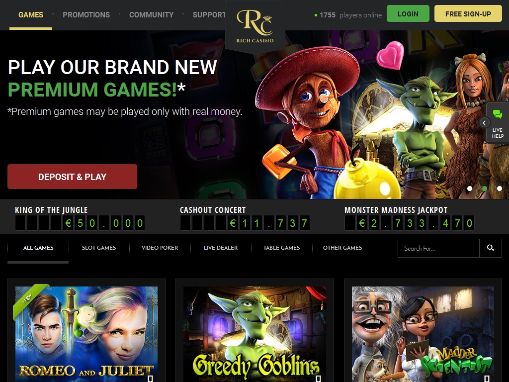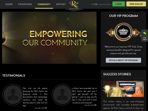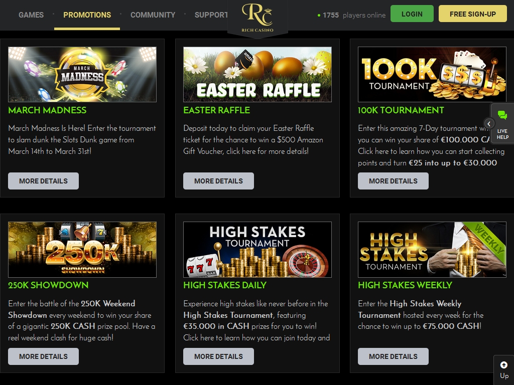 Безусловно, Rich привлекает невероятной бонусной программой, многочисленными розыгрышами, солидными турнирами, огромными джекпотами и мощнейшей системой комп-пойнтов с несколькими уровнями игроков. Хайроллеров здесь ждут дополнительные преимущества в виде специальных бонусов и мероприятий. Также довольно неплох ассортимент игр.