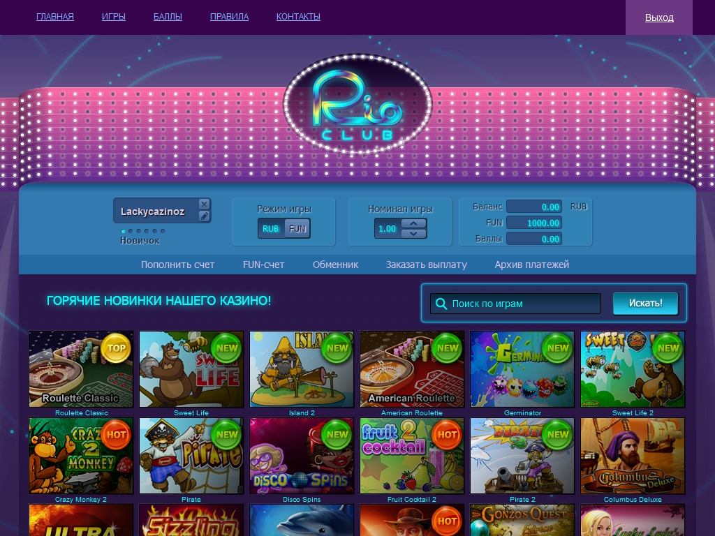 Клуб Рио отличное казино с ярким и красочным дизайном!С лёгкой регистрацией!Хороший выбор азартных игр!Отличная бонусная политика!Ввод и вывод средств можно осуществлять различными способами!