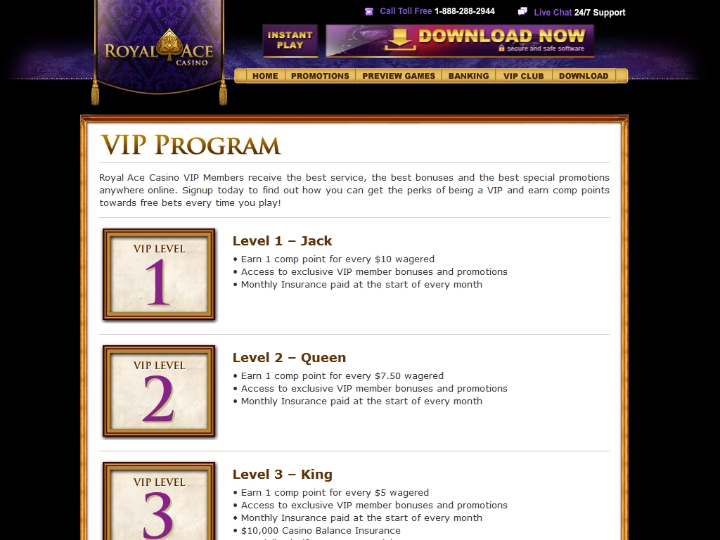 Все клиенты Royal Ace Casino автоматически участвуют в семиуровневой программе лояльности (VIP-клуб), дающей им многочисленные преимущества.