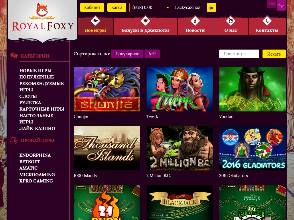 В Royal Foxy есть модели производства BetSoft, Amatic, Endorphina, Microgaming и XPro Gaming. Они разбиты по следующим группам: