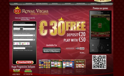 Чтобы стать клиентом Royal Vegas Mobile Casino, нужно заполнить небольшую форму в левой части главной страницы сайта, где указывается страна проживания, номер и модель телефона, а также желаемая игра (каждая игра казино на телефон скачивается отдельно). На указанный номер придет сообщение со ссылкой, перейдя по которой можно будет загрузить выбранную игру. После этого нужно будет пройти несложную процедуру регистрации, выбрать режим игры на реальные деньги и сделать первый депозит.