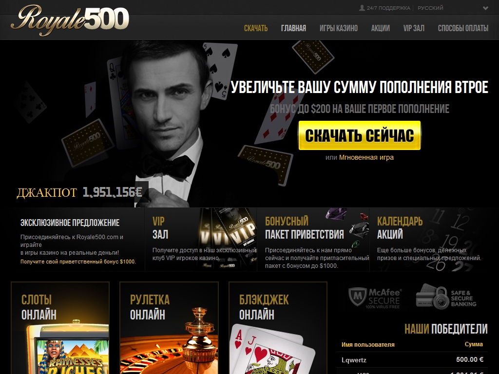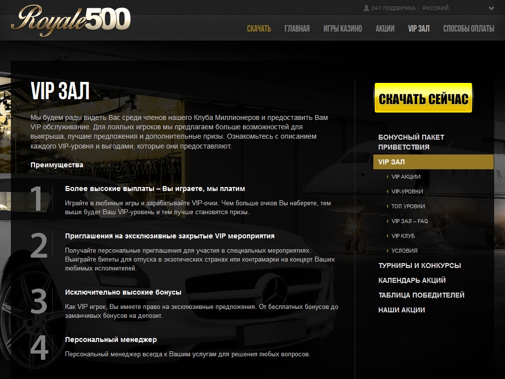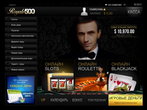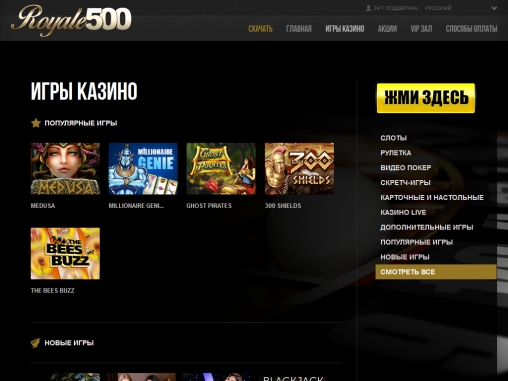 Темный фон, золотой логотип, обилие желтых элементов в дизайне, мужчина в смокинге и бабочке на главной странице – все это дает понять, что разработчики позиционируют royale500.com как шикарное заведение для солидной публики.