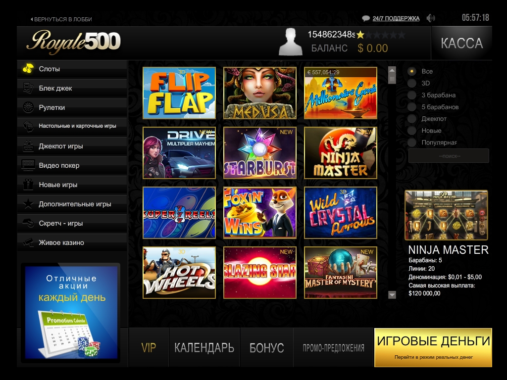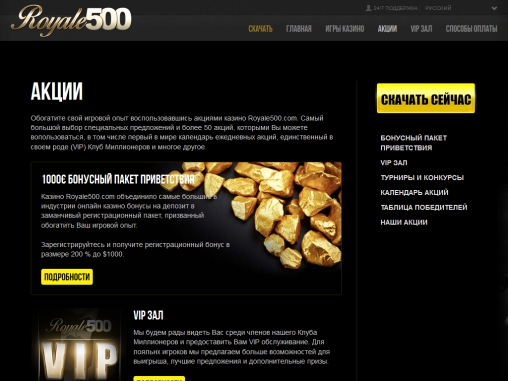 Новичков и постоянных игроков Royale 500 поощряет разнообразными бонусами и акциями. На постоянной основе действуют самые разные предложения.