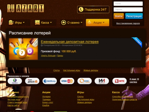 В казино также проводится еженедельная депозитная лотерея. Клиенты получают билеты на участие в ней за пополнения счета. Каждую неделю случайным розыгрышем определяются несколько победителей, которые получают призовые выплаты.