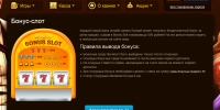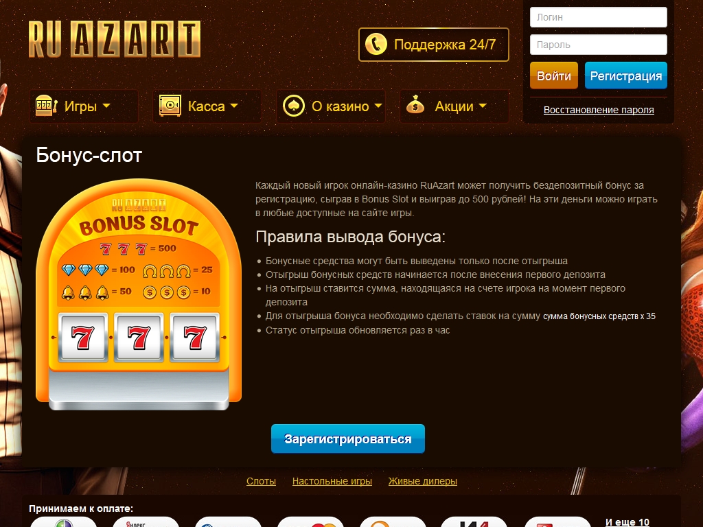 Новые клиенты, которые впервые регистрируются в заведении, получают бездепозитный бонус. Он представляет собой возможность сыграть в игру Bonus Slot. Сделав бесплатную ставку, вы можете выиграть до пятисот рублей, которые затем можно будет использовать в любых моделях. Это бонусные средства, которые нужно отыграть в тридцать пять раз, прежде чем их можно будет снять.