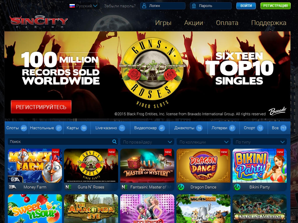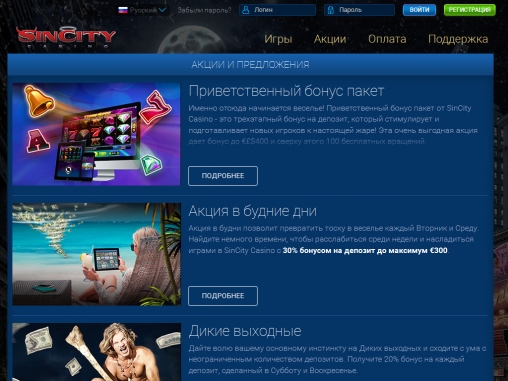 Отличный выбор качественных игр, наличие моделей с живыми дилерами, огромные джекпоты, разнообразные бонусы, поддержка русского языка, возможность вводить и выводить деньги в разных валютах многочисленными способами, стильный дизайн, удобное меню – таковы главные достоинства казино SinCity.