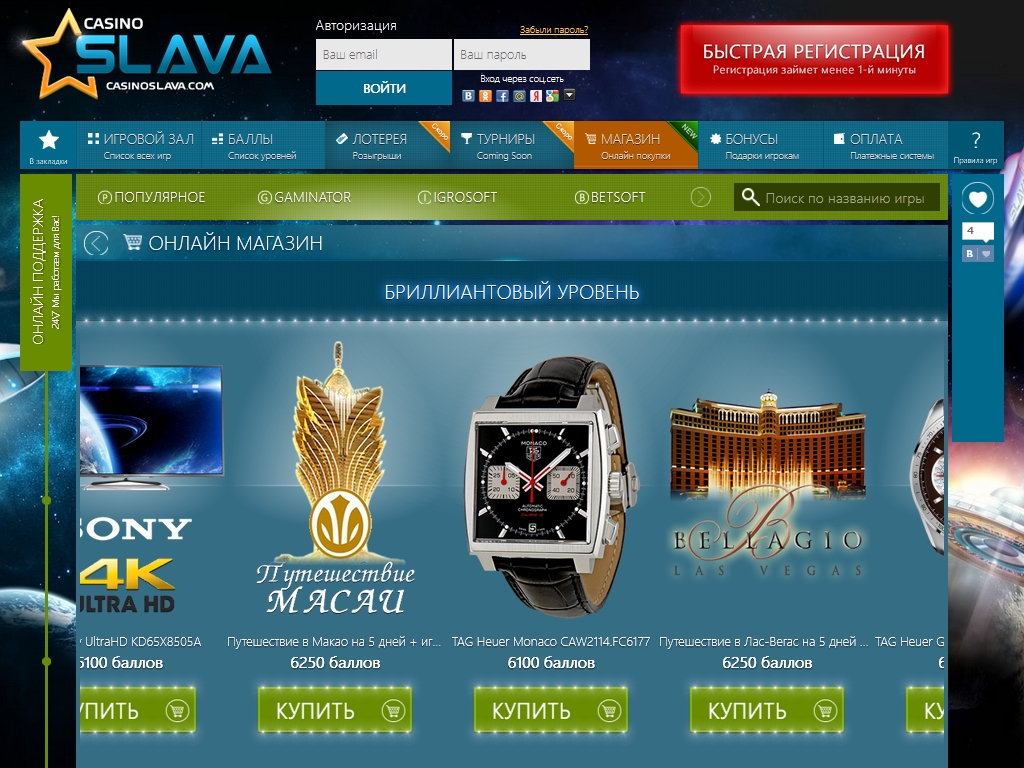 - Программа лояльности состоит из нескольких уровней. За каждые пять тысяч рублей, в сумме поставленные на кон реальными деньгами, вы будете получать один балл. Накопив достаточное количество таких очков, вы сможете менять их на деньги или же приобретать ценные товары в магазине.