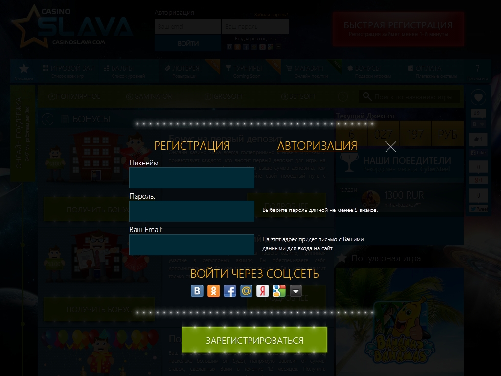 Пополнить игровой счет в «Слава» казино можно на сумму от десяти рублей.