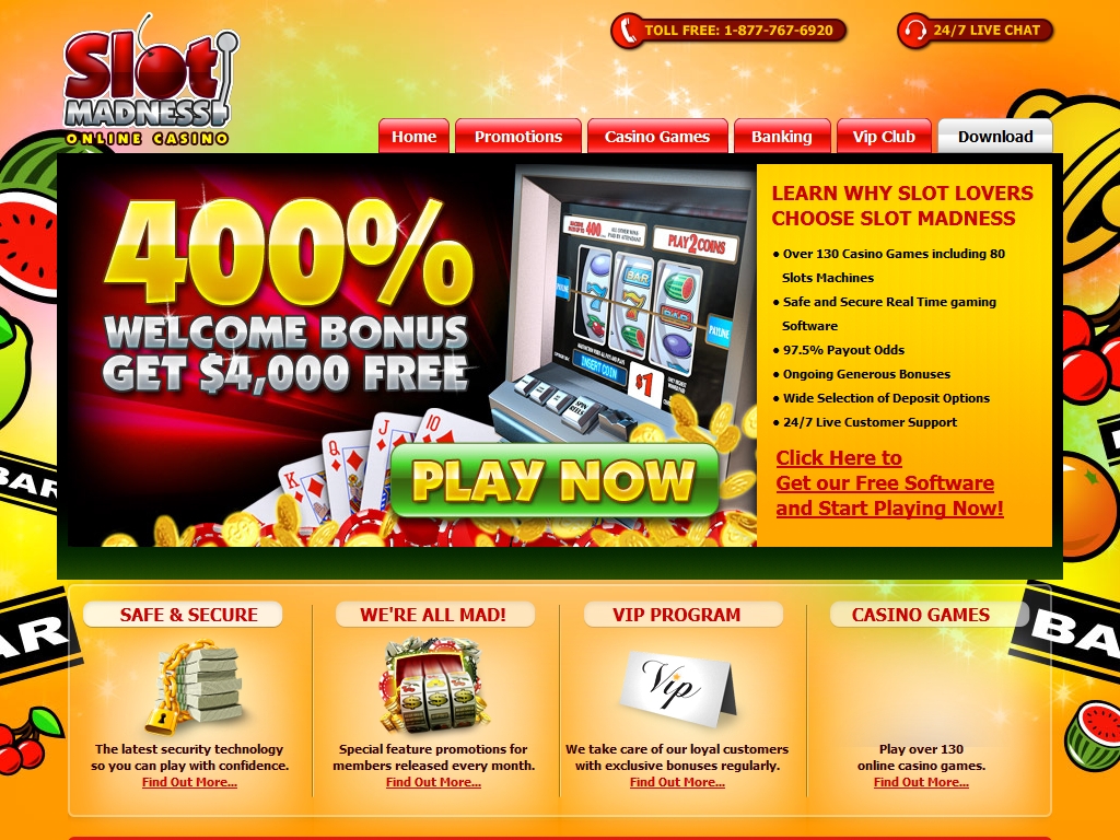 Пусть вас не смущает название Slot Madness («Слот-безумие»). В этом онлайн-казино предлагаются не только игровые автоматы, но также приличный выбор других азартных игр от компании Real Time Gaming. А главная изюминка заведения – его обширная бонусная программа.