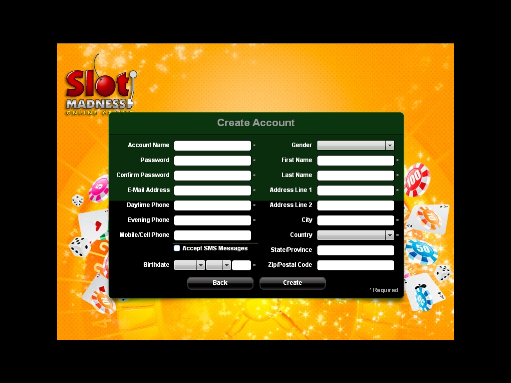 Чтобы получить 400% пригласительный бонус до $4000, новые клиенты Slot Madness Casino должны установить программу казино, открыть счет для игры на реальные деньги, внести первый депозит до $1000 и ввести в специальное окошко код WELCOME. Бонус необходимо отыграть в соответствии с правилами казино.