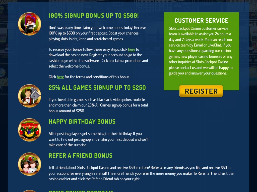 Особый бонус начисляется всем клиентам, которые вносят депозиты в свой день рождения. Также в Slots Jackpot Casino действует программа лояльности, гарантирующая различные выгоды постоянным игрокам, и проводятся другие акции.