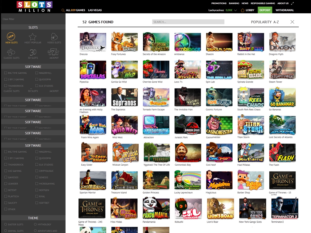 На момент написания обзора в Slots Million было доступно порядка 850 азартных игр. Не исключено, что сейчас, когда вы читаете статью, их гораздо больше, ведь администрация постоянно следит за обновлениями ассортимента известных производителей софта и расширяет список предлагаемых моделей самыми интересными новинками.