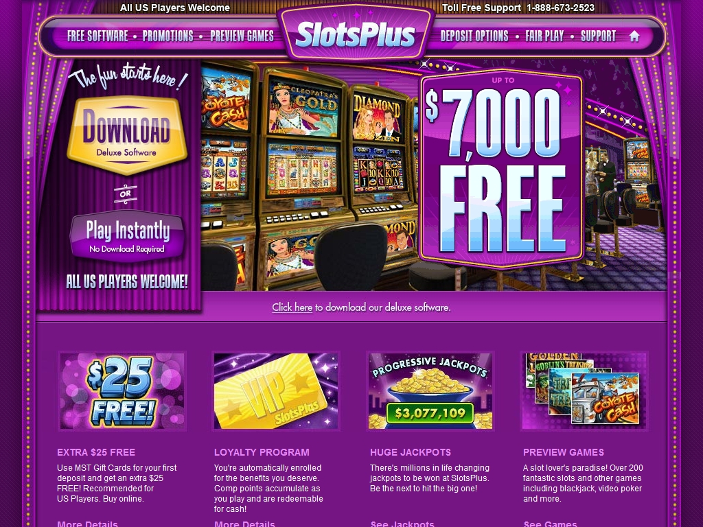 Новые клиенты Slots Plus Casino, зарегистрировавшие счета для игры на реальные деньги, получают бонусы на первые два депозита. Сначала им полагается 200% бонус размером до $7000, а затем 125% бонус. Отыгрывать их нужно в тридцать раз (бонус плюс депозит). Подробности уточняйте в правилах на сайте.