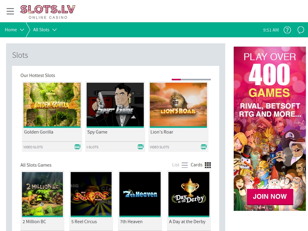 В интернет-гемблинге довольно много онлайн-казино со словом “slots” в названии, которые, тем не менее, предлагают клиентам не только игровые автоматы, но также ряд моделей других жанров. Портал Slots.lv является одним из подобных заведений. Здесь вас ждет подборка отличных видео-слотов, всевозможные настольные, карточные и развлекательные азартные игры. Обо всех его услугах читайте далее в статье.