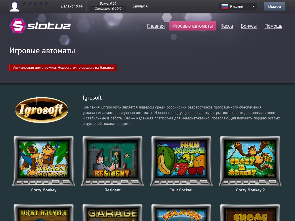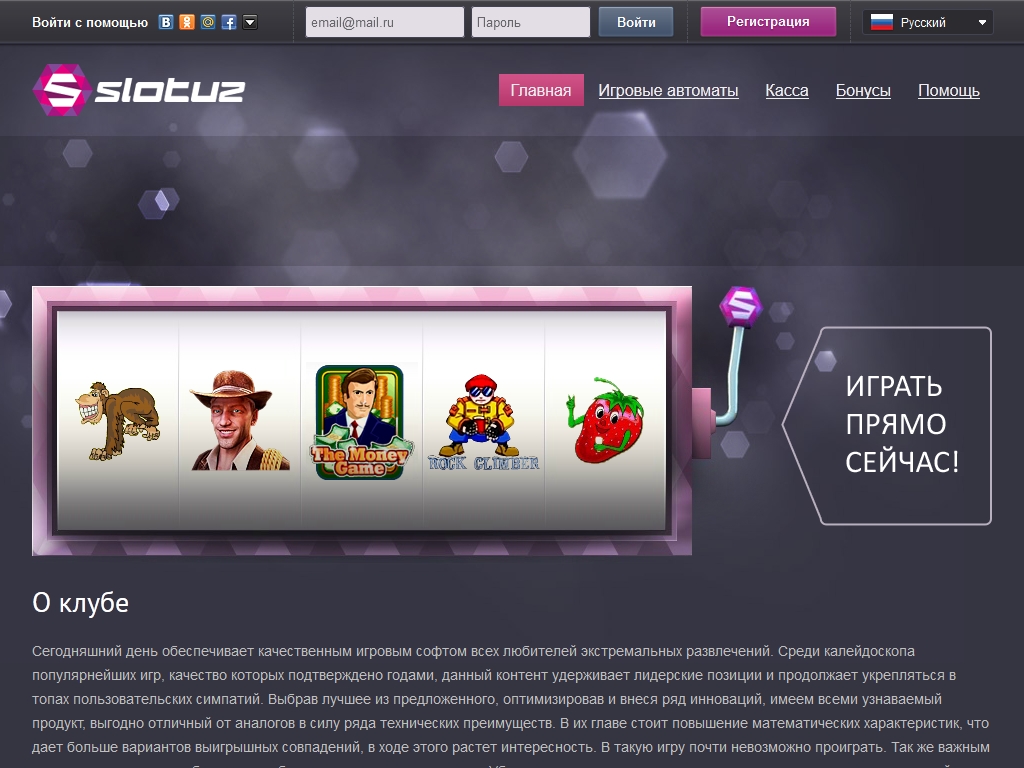 Игровой онлайн-клуб «Слотуз», которому посвящен данный обзор, не может похвастаться широким выбором игр, однако некоторые его особенности и предложения наверняка заинтересуют многих наших читателей, неравнодушных к игровым автоматам.