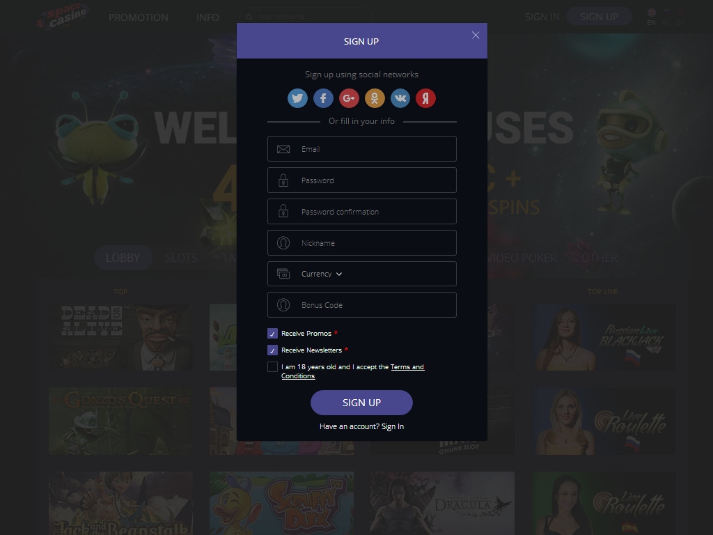 При регистрации нужно ввести личные данные и контактную информацию, выбрать игровую валюту и псевдоним, а также указать, хотите ли вы получать новостную рассылку. Если у вас есть бонусный код, введите его в специальное окошко. Разрешается входить в кабинет, используя аккаунты из социальных сетей.