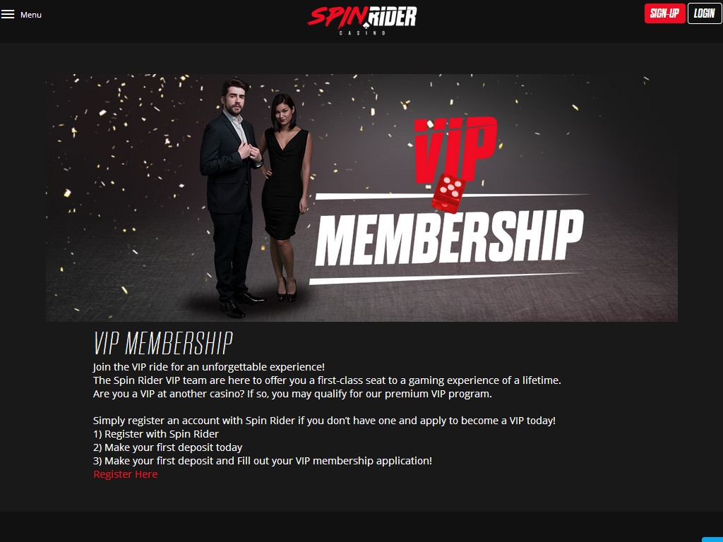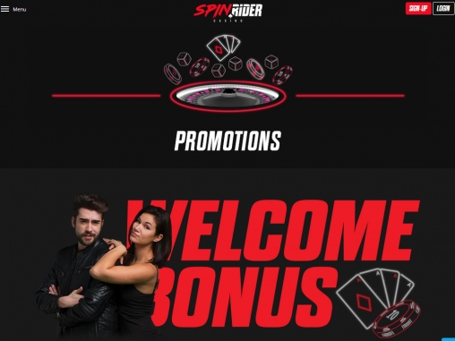 Spin Rider mobile casino оформлено в таком же броском стиле с красно-черной цветовой гаммой и огромным баннером на главной странице. От анимационных эффектов разработчики отказались, чтобы ускорить загрузку сайта при невысокой скорости интернета.
