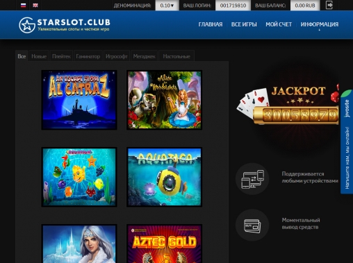 На сайте утверждается, что клиентам предлагаются игры Gaminator, Igrosoft, Megajack и Playtech. Как говорилось выше в обзоре Star Slot, у нас есть сомнения в том, что софт оригинальный. Если руководство проекта готово их развеять, мы будем рады подкорректировать информацию в статье.