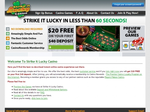 Сеть CasinoRewards объединяет три десятка онлайн-казино, предлагающих клиентам единую программу лояльности, совместные розыгрыши, крупные турниры, огромные джекпоты и сотни азартных игр Microgaming. Одним из этих порталов является Strike It Lucky. О нем идет речь далее.