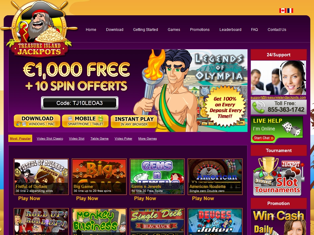 Казино Treasure Island Jackpots доступно только на английском (основная версия) и французском языках.