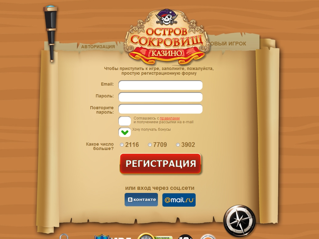 Подобно многим современным игорным сайтам, ориентированным, в первую очередь, на русскоязычную аудиторию, «Остров сокровищ» предлагаем максимально простую процедуру регистрации. Нужно всего лишь выбрать себе ник и пароль, а также указать адрес электронной почты. Разрешается даже войти на портал, используя аккаунт в социальных сетях «Мой Мир» или «Вконтакте».