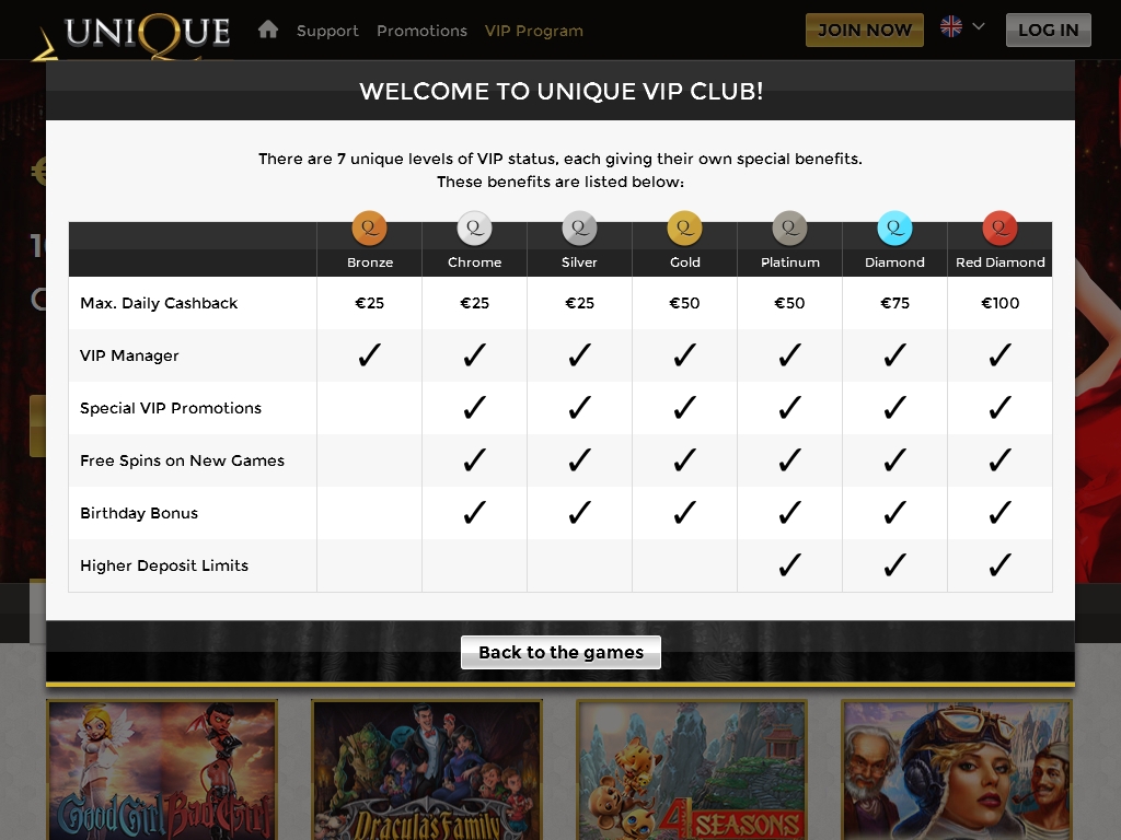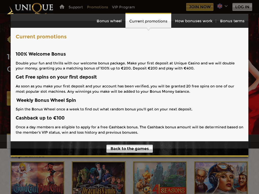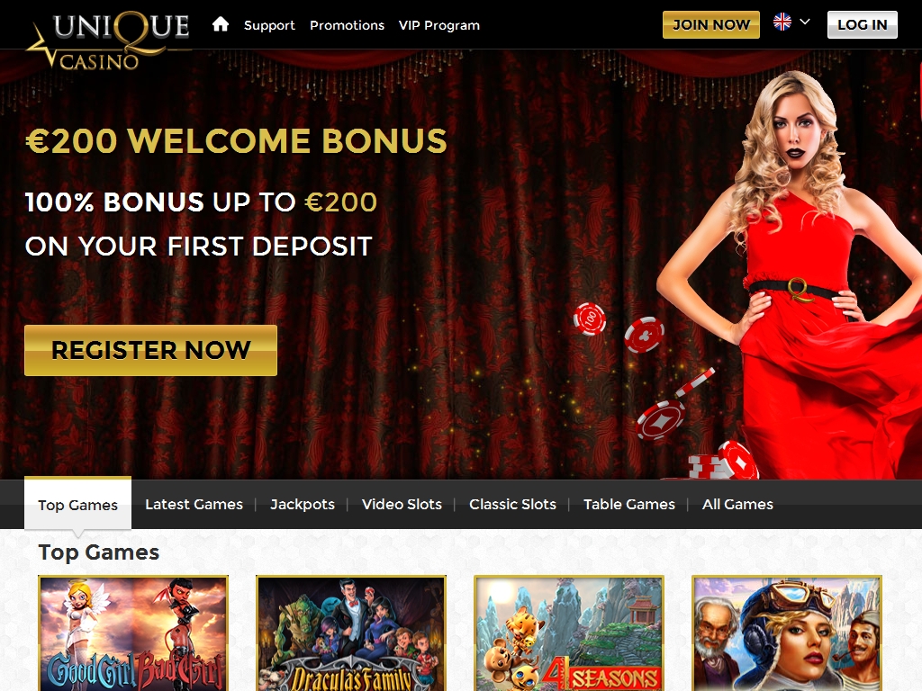 «Уникальное казино», работающее по адресу uniquecasino.com, предлагает вам впечатляющий ассортимент онлайн-игр разных брендов, многочисленные бонусные акции нескольких видов, кэшбек и другие виды услуг, которые могут вас заинтересовать.