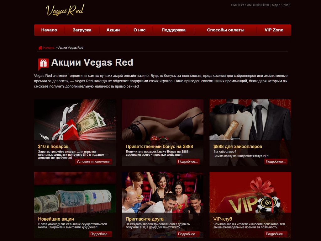 Даже при очень большом желании придраться к качеству услуг, предоставляемых в данном заведении, сделать это весьма сложно. Его оператором является одна из самых авторитетных и опытных компаний в онлайн-гемблинге. Казино работает на очень качественном софте, предлагая огромный выбор моделей. Всем клиентам предлагаются многочисленные бонусы и другие промо-акции. Есть интерфейс на разных языках. Вносить и выводить деньги можно практически всеми удобными способами. Действует очень широкий диапазон ставок. В общем, перечислять достоинства Vegas Red можно очень долго.