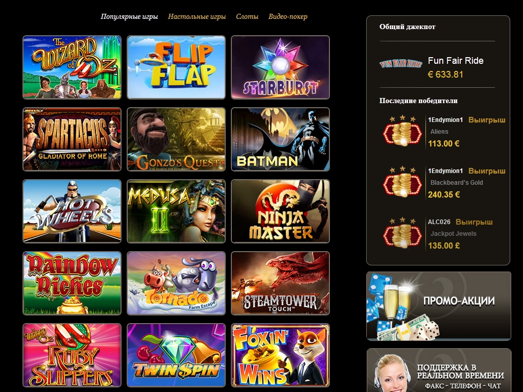 - Слоты – Самая многочисленная категория с огромным выбором всевозможных классических игровых автоматов и видео-слотов. Они посвящены разным тематиками и обладают всевозможными опциями геймплея (особые символы, бонусные раунды, фри-спины, накопительные джекпоты и так далее). В их числе есть 3D-слоты с отменной графикой.