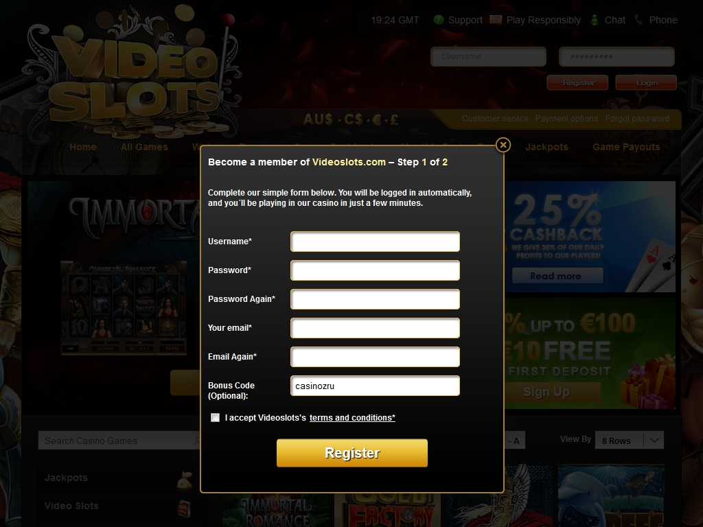 Чтобы стать полноценным клиентом videoslots.com, нужно открыть аккаунт. Процесс регистрации простой и интуитивно понятный. Вы заполняете анкету, подтверждаете указанные контактные данные и можете приступать к игре.