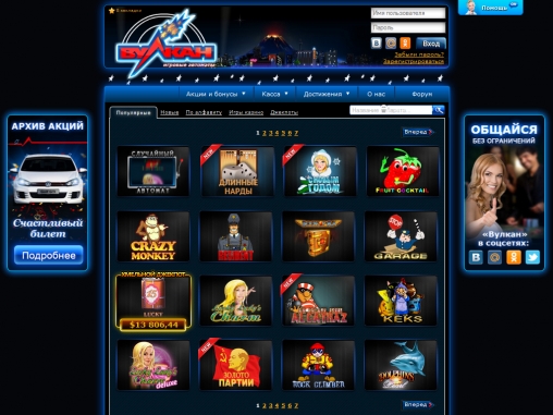 Сайт игорного клуба «Вулкан» выполнен на черном фоне. В глаза немедленно бросает хорошо всем известный логотип на фоне ночного города, раскинувшегося вокруг вулкана. Также привлекают внимание рекламные баннеры бонусов и популярных слотов. Пользоваться ресурсом удобно.