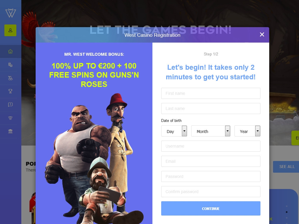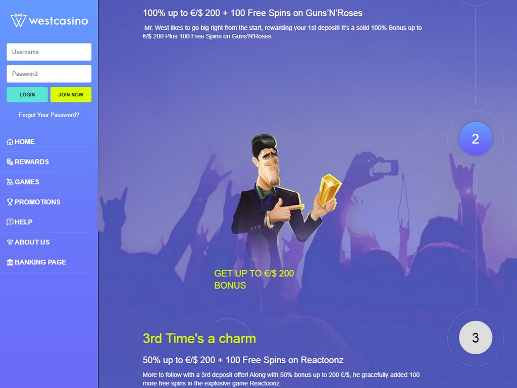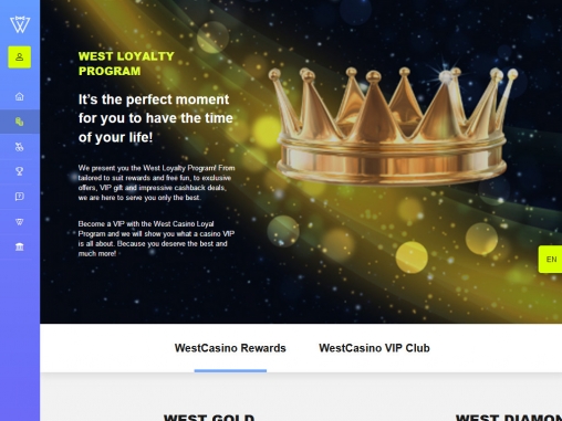 Символом WestCasino стал некто Мистер Вест. Это обаятельный брюнет в стильных очках и безупречном костюме. Он приглашает вас стать членом клуба джентльменов, чтобы получить доступ к многочисленным бонусам, акциям, играм, джекпотам и турнирам.