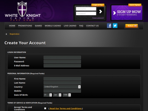 Нам показалось, что White Knight Casino в наибольшей степени заинтересовано в клиентах из Великобритании, хотя для игроков из других стран каких-либо существенных ограничений нет. Внимательно изучите пользовательское соглашение White Knight Casino, и если вас все устроит, можете попробовать зарегистрироваться в нем.