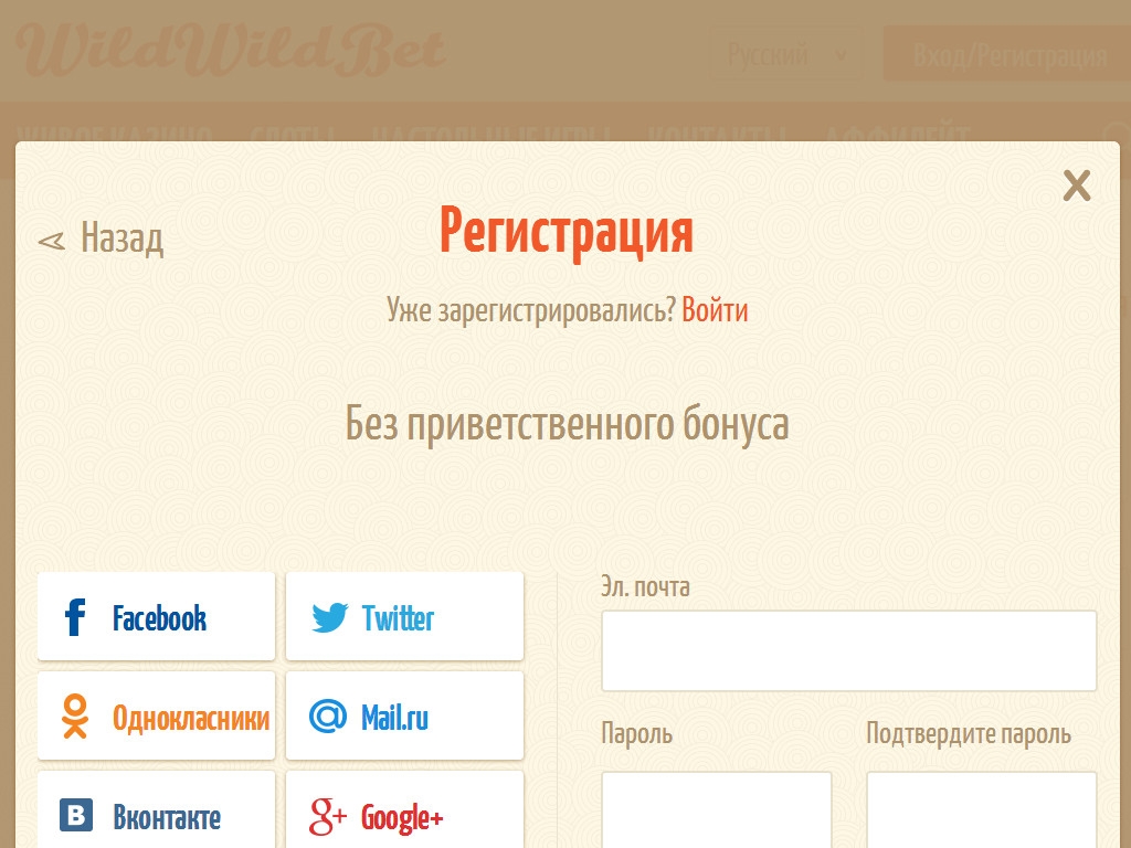 Процесс регистрации аккаунта упрощен до предела. Можно даже войти на сайт через профили из популярных социальных сетей.