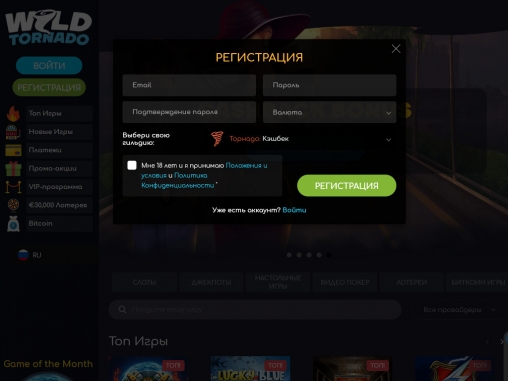 Зарегистрироваться в WildTornado можно за пару минут. Внимательно заполните анкету достоверными личными данными и подтвердите указанный адрес электронной почты, чтобы активировать аккаунт.