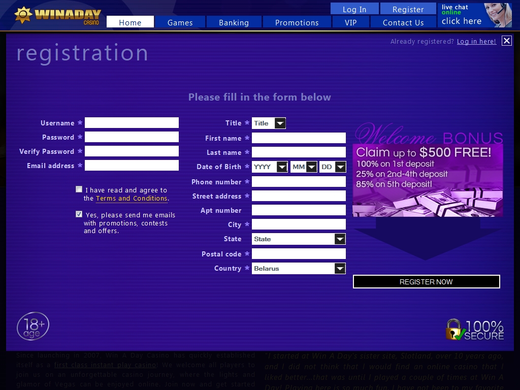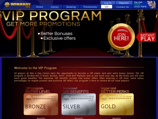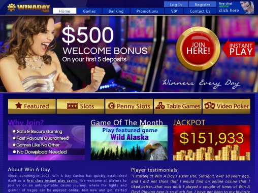 Также в Win A Day Casino действуют различные другие бонусы (ежедневные, еженедельные, периодические, 10% на депозиты от $500) и другие.