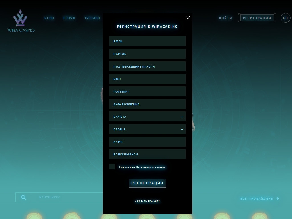 Чтобы получить возможность играть в Wira casino на деньги, необходимо зарегистрироваться. В анкете необходимо указать достоверные данные, выбрать предпочтительную валюту и подтвердить контактный адрес электронной почты.