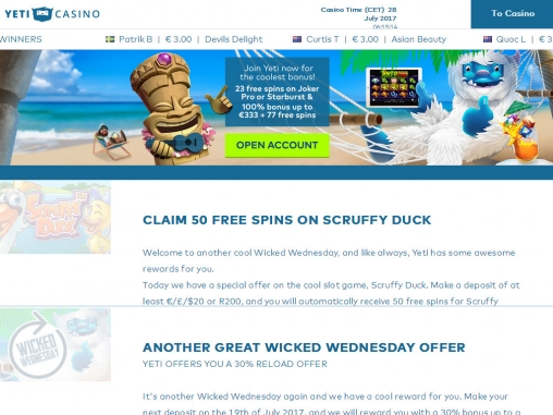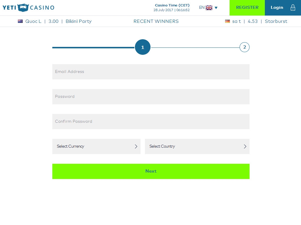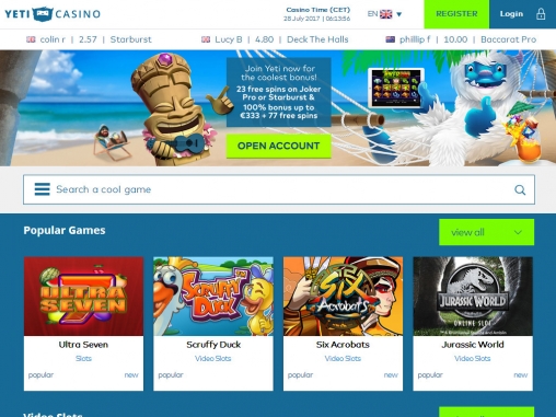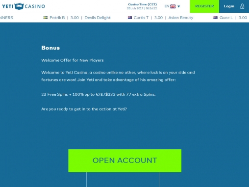 К регистрации в Yeti не допускаются жители некоторых стран, включая США и Россию. Играть в казино на деньги разрешается с восемнадцати лет.