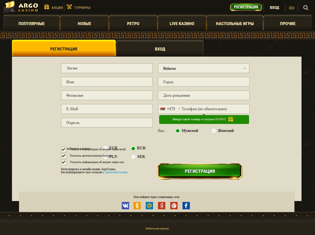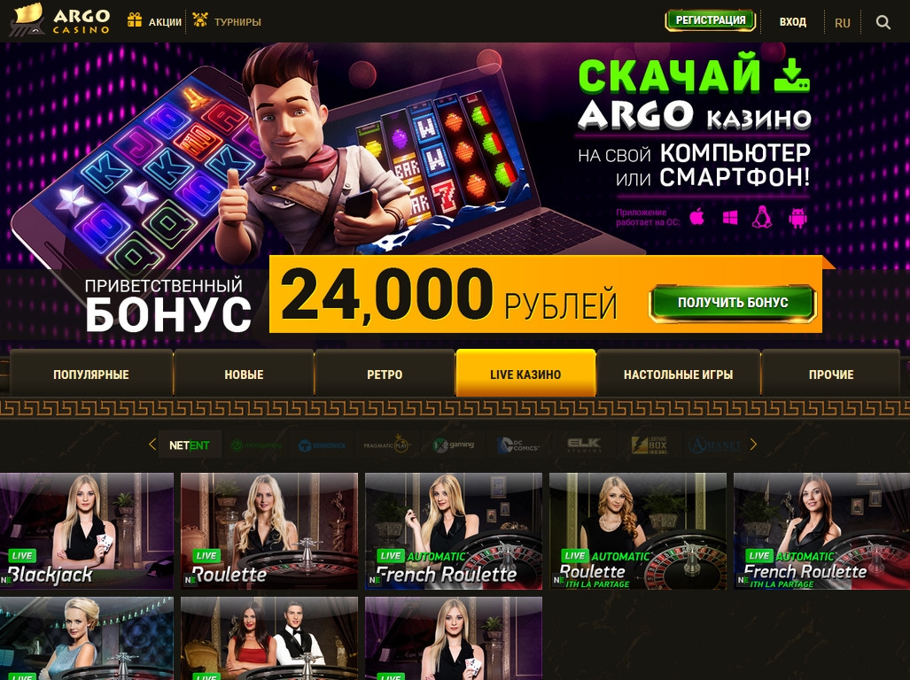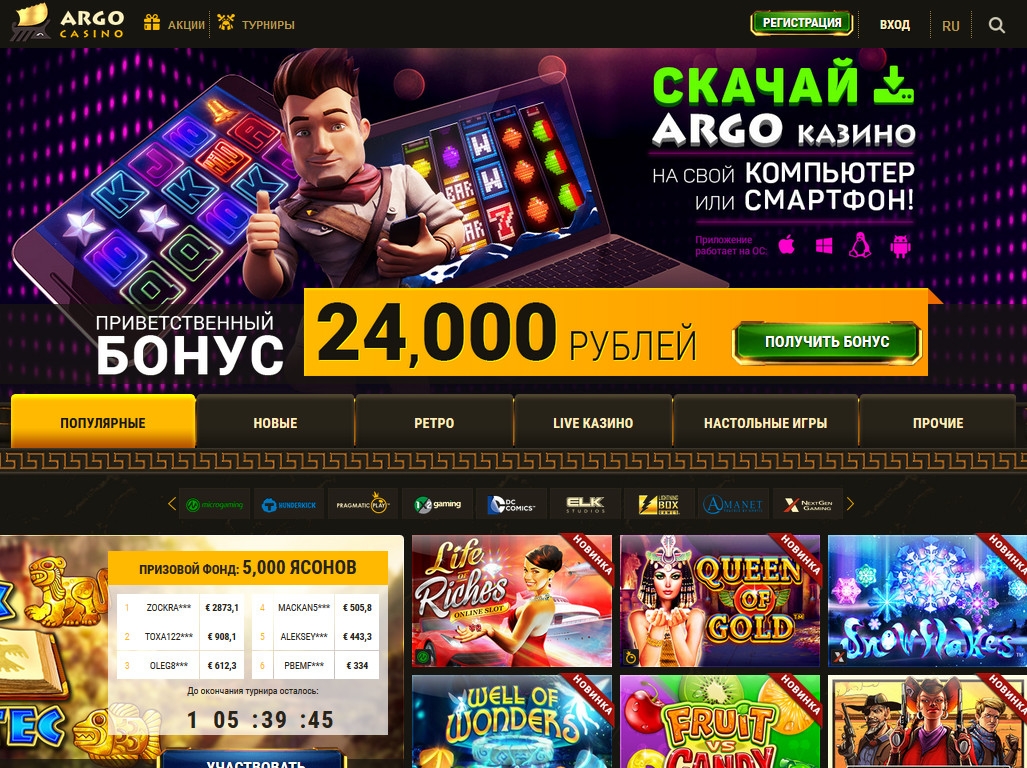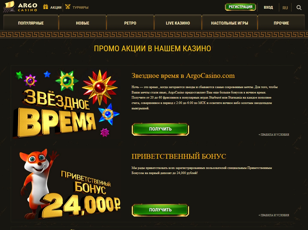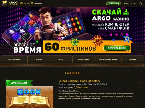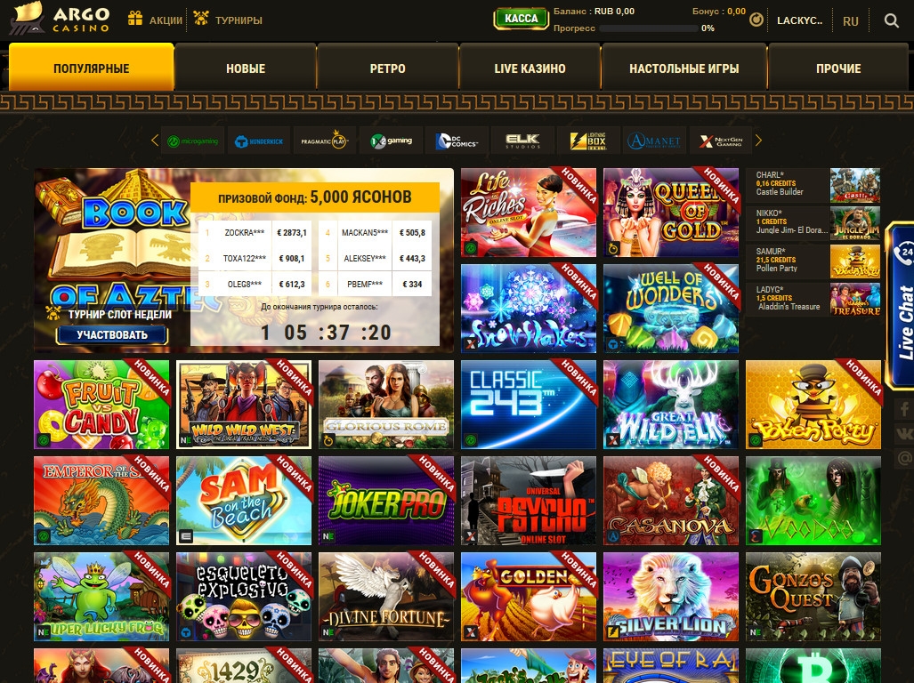 Перечень игр очень внушительный. В их числе лайв-казино «Арго» и модели с прогрессивными джекпотами. Пользователям доступны турниры, все бонусы и акции заведения.
