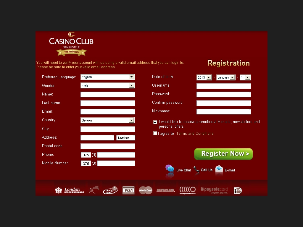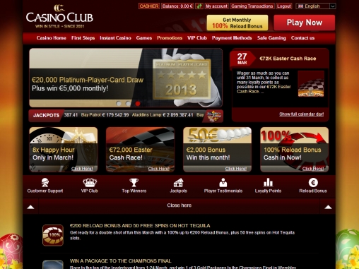 В этом онлайн-казино, как и в большинстве других, предусмотрен стандартный бонус на первый депозит: Casino Club предоставляет новым игрокам, впервые пополняющим личный счет, бонус в размере 50% от суммы депозита (максимальный размер бонуса составляет 100 евро). И особый подарок для любителей игровых автоматов – в дополнение к приветственному бонусу можно получить пятьдесят бесплатных спинов на любых игровых автоматах. Единственное условие для получения бонуса – минимальная сумма депозита в 20 евро