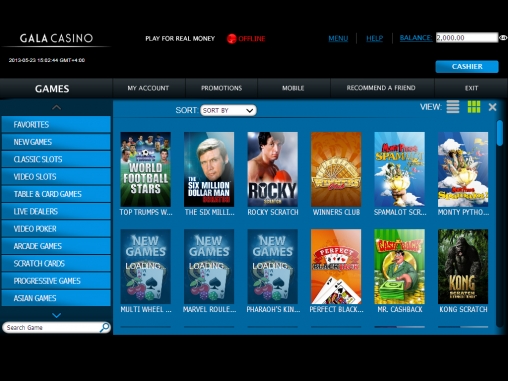 В Gala Casino представлен широкий выбор разнообразных онлайн-игр производства Playtech. Все модели разбиты на несколько категорий: видео-слоты, классические игровые автоматы, настольные игры, карточные игры, видео-покеры, игры с живыми дилерами и развлекательные игры. Также в отдельные группы вынесены игры с джек-потами, новые и самые популярные модели.