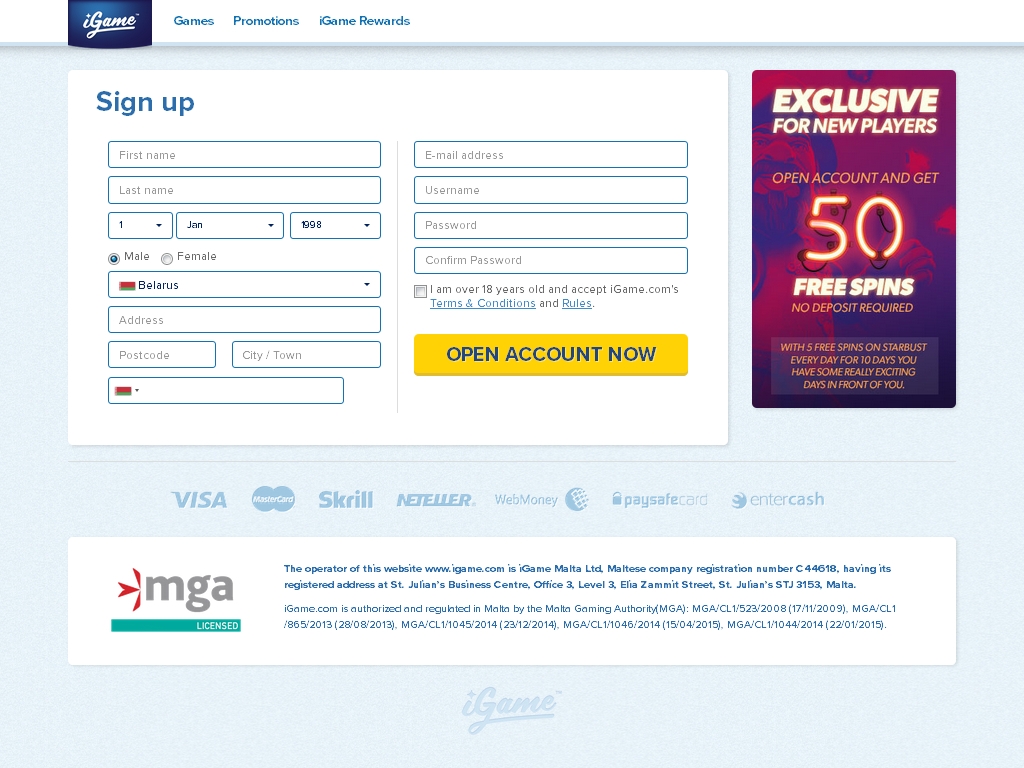 К регистрации в iGame casino не допускаются жителя некоторых стран, перечисленных в пользовательском соглашении. В их числе США, Греция, Турция и несколько десятков других государств и территорий.