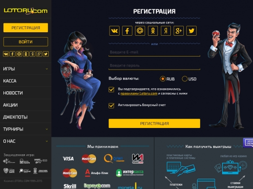 Играть в Lotoru.com можно в долларах США и российских рублях. Платежи принимаются многочисленными способами, в числе которых карты Visa и MasterCard, системы Moneta, Liqpay, Skrill и другие популярные методы. Многие из них можно использовать для снятия выигранных денег.