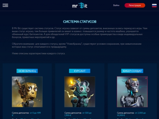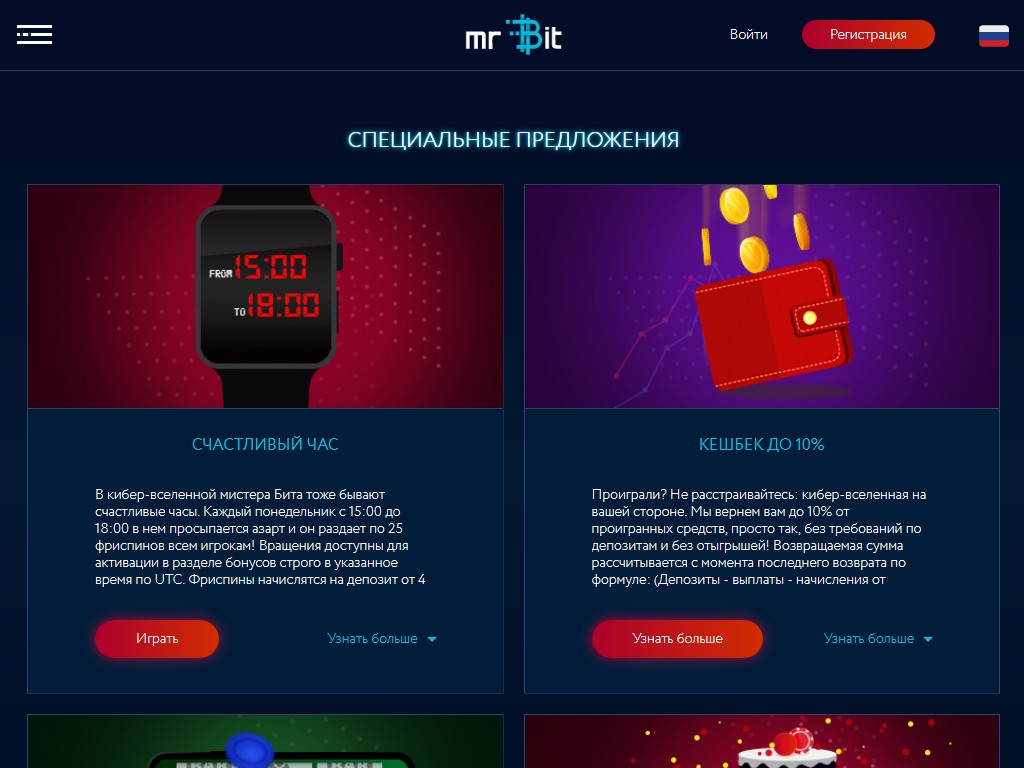 В Mr Bit mobile casino представлен внушительный выбор игр. Здесь доступны все бонусы и акции. Вы можете пользоваться данной версией, не открывая новый счет.