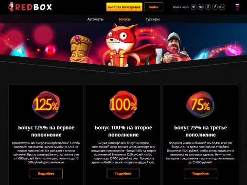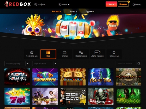 Интернет-казино Red Box начало работу в январе 2018 года. Это перспективный игорный портал с неплохой подборкой азартных развлечений, многочисленными бонусами, увлекательными турнирами, крупными джекпотами и другими предложениями.