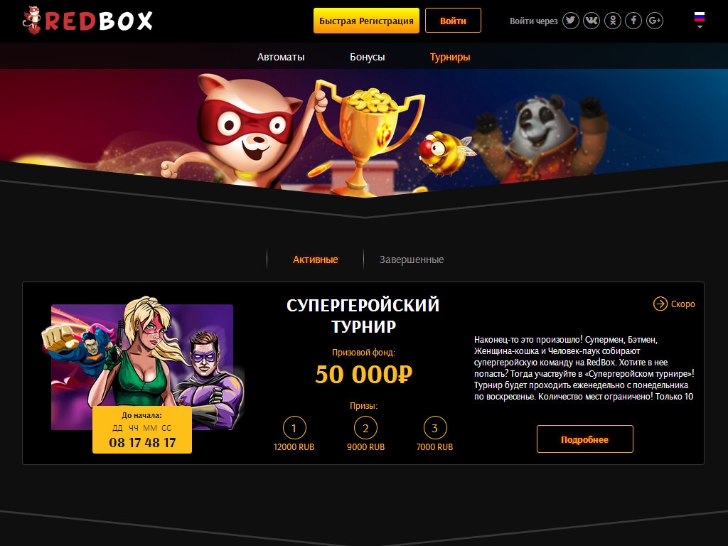 Red Box casino устраивает турниры между пользователями. Они проходят на разных условиях, поэтому следует изучать правила каждого мероприятия.